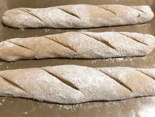 5. Brote schräg einschneiden, mit Wasser besprühen.