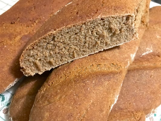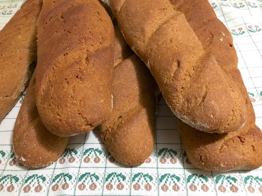 6. Ins Backrohr eine kleine Schüssel mit Wasser stellen, Backbleche mit Brot einschieben und bei ca. 200°C (Umluft) 40 Minuten backen.