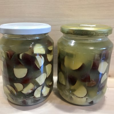 Im Frühjahr habe ich mit den wunderschönen Blüten schon eine Tinktur gemacht, die ja bekanntlich für gesunde Venen sorgt, also bei Krampfadern, Besenreisern, Hämorrhoiden, Arterienverkalkung usw. Das gleiche mache in nun mit den Früchten, den Kastanien. Ich suche welche, die noch in der Schale sind, bereits ausgeschälte wasche ich in heißem Wasser, trockne sie ab, und zerkleinere sie dann. Kleine Kastanien viertle ich, größere zerteile ich öfter. Ich übergieße sie mit 40%-igem Alkohol und lasse die Gläser ich 4-6 Wochen stehen. Nicht in direktem Sonnenlicht, besser dunkel und alle paar Tage schwenken. Ich wickle die Gläser in ein Handtuch.