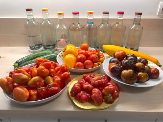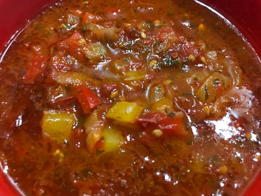 Die großen Fleischtomaten aus meinem Garten habe ich zu einer köstlichen Sauce verarbeitet, mit Paprika, Zwiebel und scharfen Pfefferonis, die ich noch getrocknet vom Vorjahr hatte.